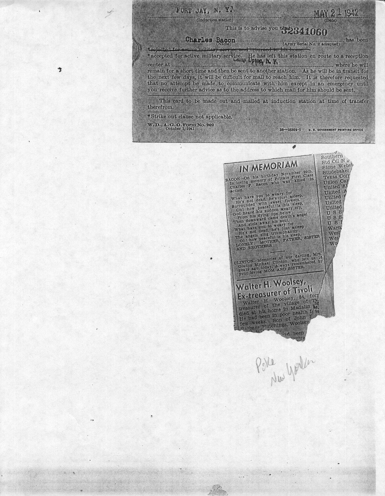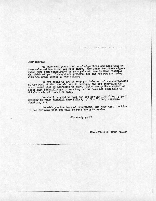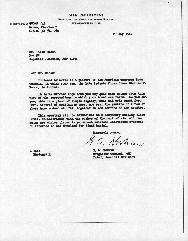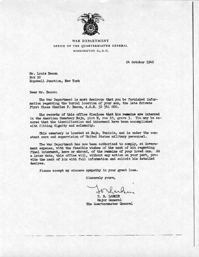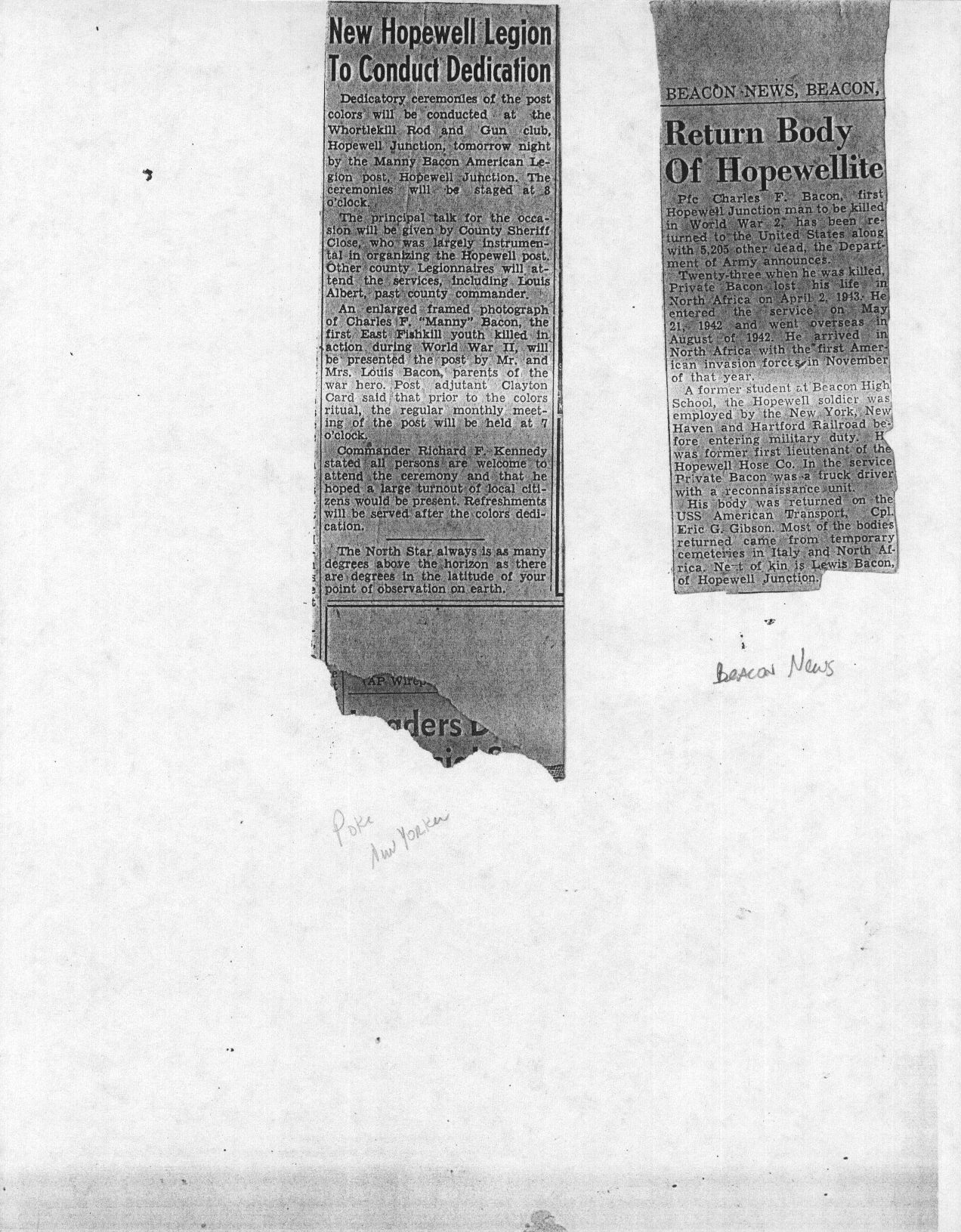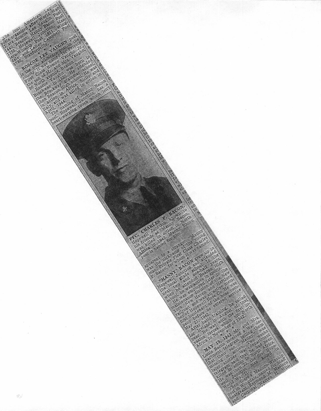 Charles Peter “Manny” Bacon was born November 29th 1919. Manny grew up in Hopewell Junction in a house near what is currently The Hopewell Inn on Route 376. He attended Elementary School in the Three Room Schoolhouse on Beekman Road. Manny entered Beacon High School in January 1934 and left March 10, 1937. After leaving school, he went to work for the maintenance division of the New York, New Haven and Hartford Railroad. At that time, Manny was also a Lieutenant of Hopewell Hose. On April 15th 1942, Manny received his induction notice to report to the Memorial Building 446 Main Street in Beacon. On May 21st, 1942, he was accepted for military service at Fort Jay, NY. After basic training, he was shipped to Ireland and was part of the invasion forces to hit North Africa in November of 1942. Manny was a member of the 9th Recon Troop. On May 19th 1943, Mr. and Mrs. Bacon were notified that Manny was missing in action. Two weeks later, another War Department telegram informed them that he had been killed in action April 20, 1943. He was the first resident of Hopewell Junction killed in World War Two. He was first interred in the American Cemetery Beja, Tunisia (plot B, row 10, grave 3). After the war, his remains were returned to the United States and he was buried in the Long Island National Cemetery at Pinelawn in Farmingdale (LI), New York. His grave is located in Section J, grave # 14770. At the time of his death, he was survived by his parents Lewis (3/10/1897-5/1966) and Marcella (6/25/1902-8/23/1994) Bacon, one sister, Margaret, and two brothers, James and Lewis. In 1949, American Legion Post 1758 was created in Hopewell Junction and named in honor of Manny. Any corrections or additional information about Manny or his family would be greatly appreciated. Please contact: Post Historian, Manny Bacon American Legion Post 1758, PO Box 92, Hopewell Jct. NY 12533 (email: historian@al-ny1758.org).