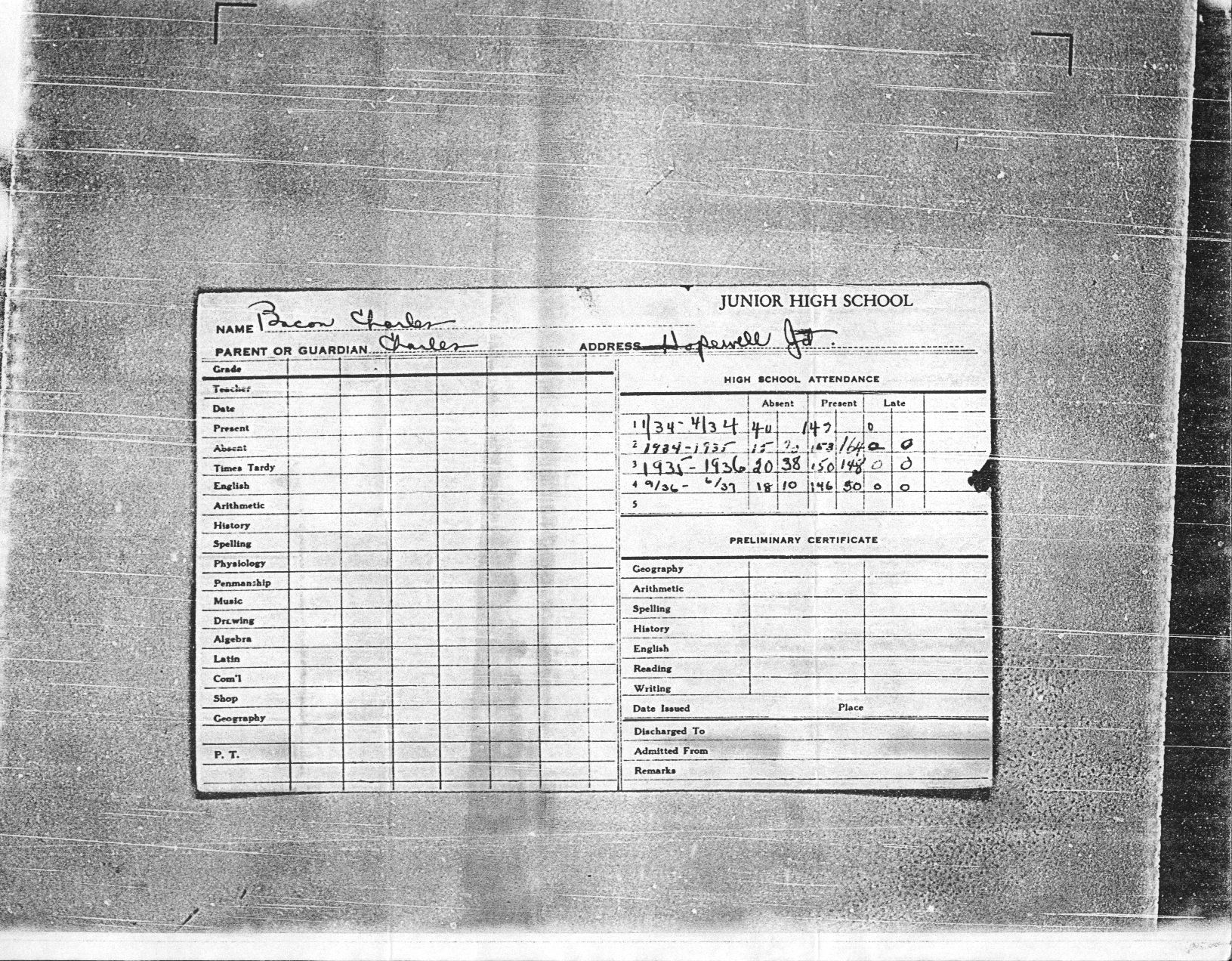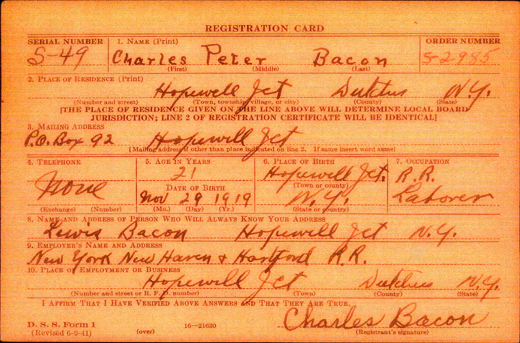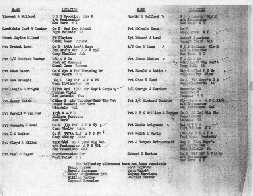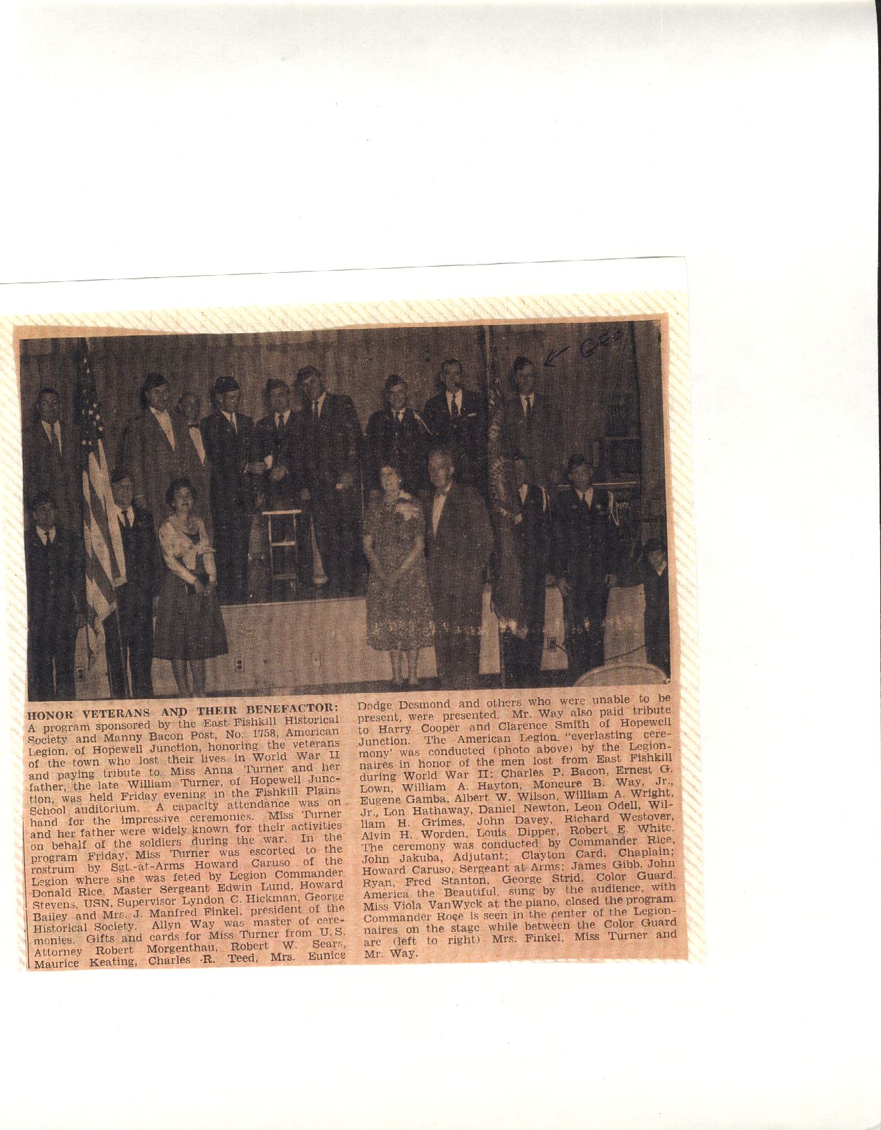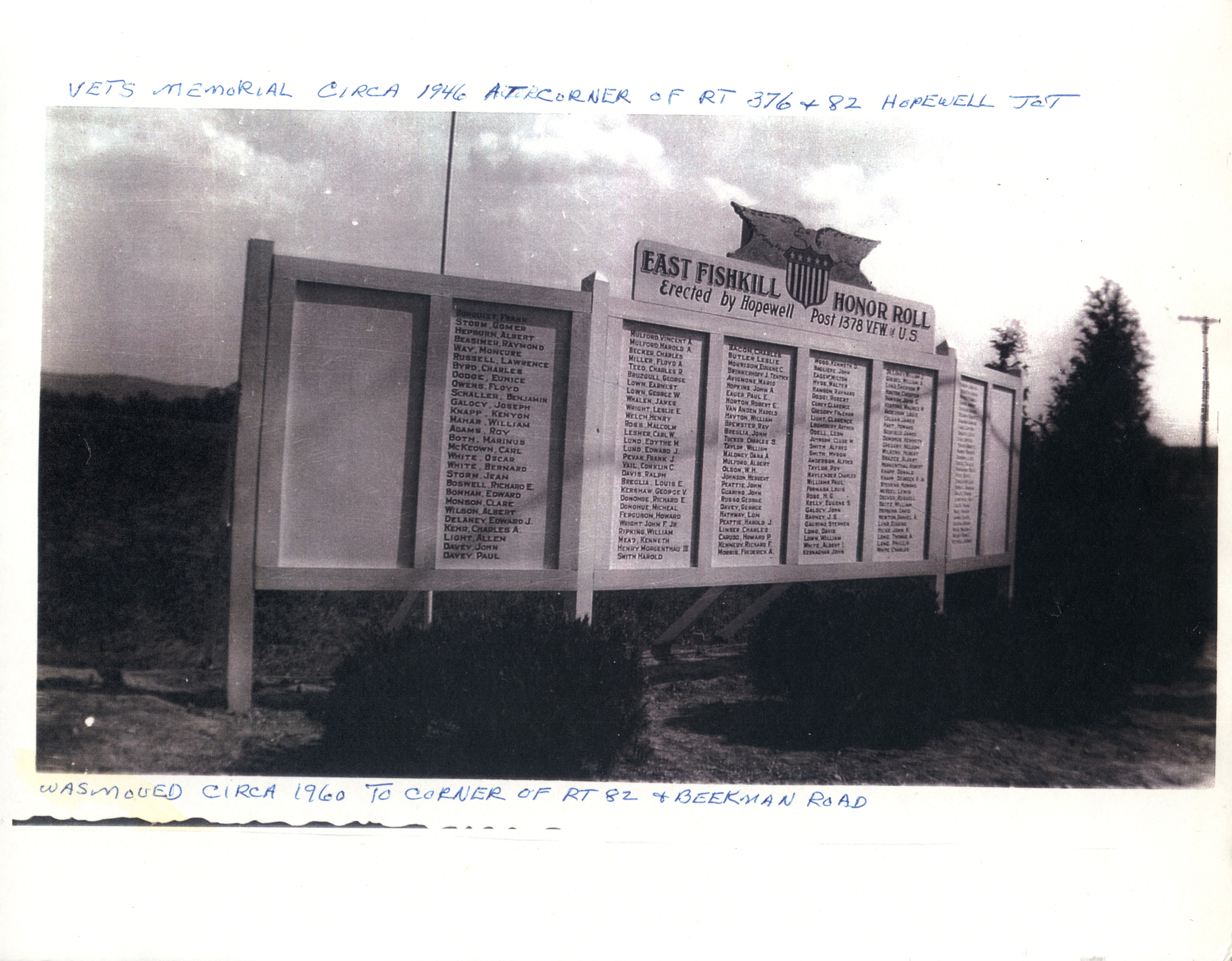 Charles Peter “Manny” Bacon was born November 29th 1919. Manny grew up in Hopewell Junction in a house near what is currently The Hopewell Inn on Route 376. He attended Elementary School in the Three Room Schoolhouse on Beekman Road. Manny entered Beacon High School in January 1934 and left March 10, 1937. After leaving school, he went to work for the maintenance division of the New York, New Haven and Hartford Railroad. At that time, Manny was also a Lieutenant of Hopewell Hose. On April 15th 1942, Manny received his induction notice to report to the Memorial Building 446 Main Street in Beacon. On May 21st, 1942, he was accepted for military service at Fort Jay, NY. After basic training, he was shipped to Ireland and was part of the invasion forces to hit North Africa in November of 1942. Manny was a member of the 9th Recon Troop. On May 19th 1943, Mr. and Mrs. Bacon were notified that Manny was missing in action. Two weeks later, another War Department telegram informed them that he had been killed in action April 20, 1943. He was the first resident of Hopewell Junction killed in World War Two. He was first interred in the American Cemetery Beja, Tunisia (plot B, row 10, grave 3). After the war, his remains were returned to the United States and he was buried in the Long Island National Cemetery at Pinelawn in Farmingdale (LI), New York. His grave is located in Section J, grave # 14770. At the time of his death, he was survived by his parents Lewis (3/10/1897-5/1966) and Marcella (6/25/1902-8/23/1994) Bacon, one sister, Margaret, and two brothers, James and Lewis. In 1949, American Legion Post 1758 was created in Hopewell Junction and named in honor of Manny. Any corrections or additional information about Manny or his family would be greatly appreciated. Please contact: Post Historian, Manny Bacon American Legion Post 1758, PO Box 92, Hopewell Jct. NY 12533 (email: historian@al-ny1758.org).